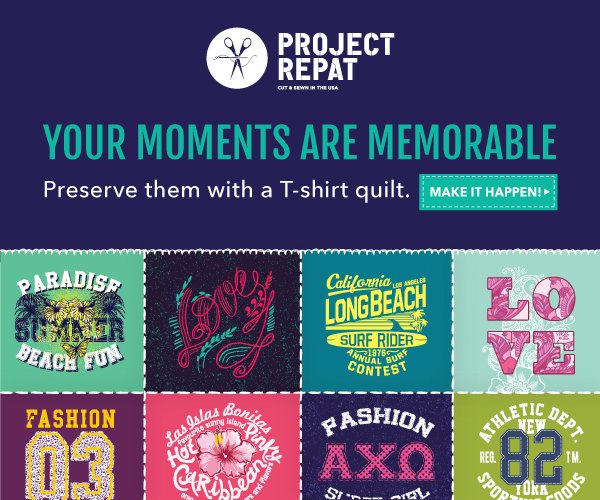 Who says you can’t show off your school spirit in the real world? Just because college is over doesn’t mean your memories have to fade away, too. Take that massive pile of school pride T-shirts and make something memorable. Upcycle them with Project Repat, stat, or make a gift for a friend who’s got more T-shirt memories than he knows what to do with. Now’s the time!