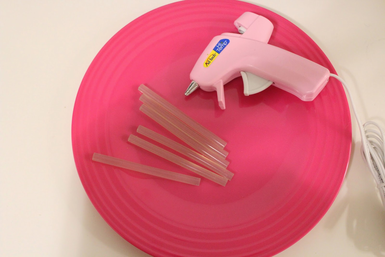 I needed something water proof so I picked a plastic plate from the Dollar Store for only 99 cents. Then I headed next door to Joann’s and went to the crafting section and picked up a hot glue gun, extra glue sticks included for only $5.