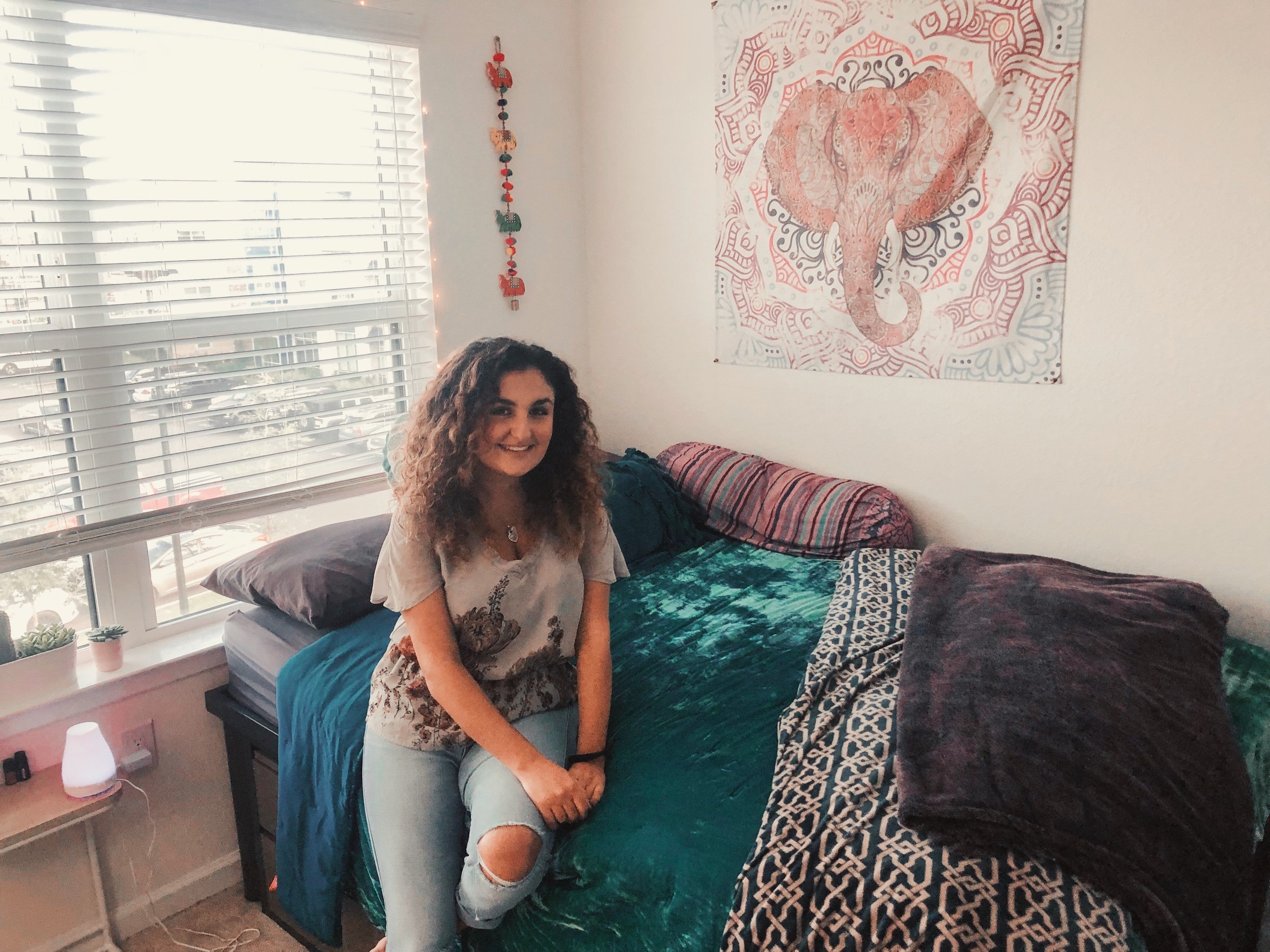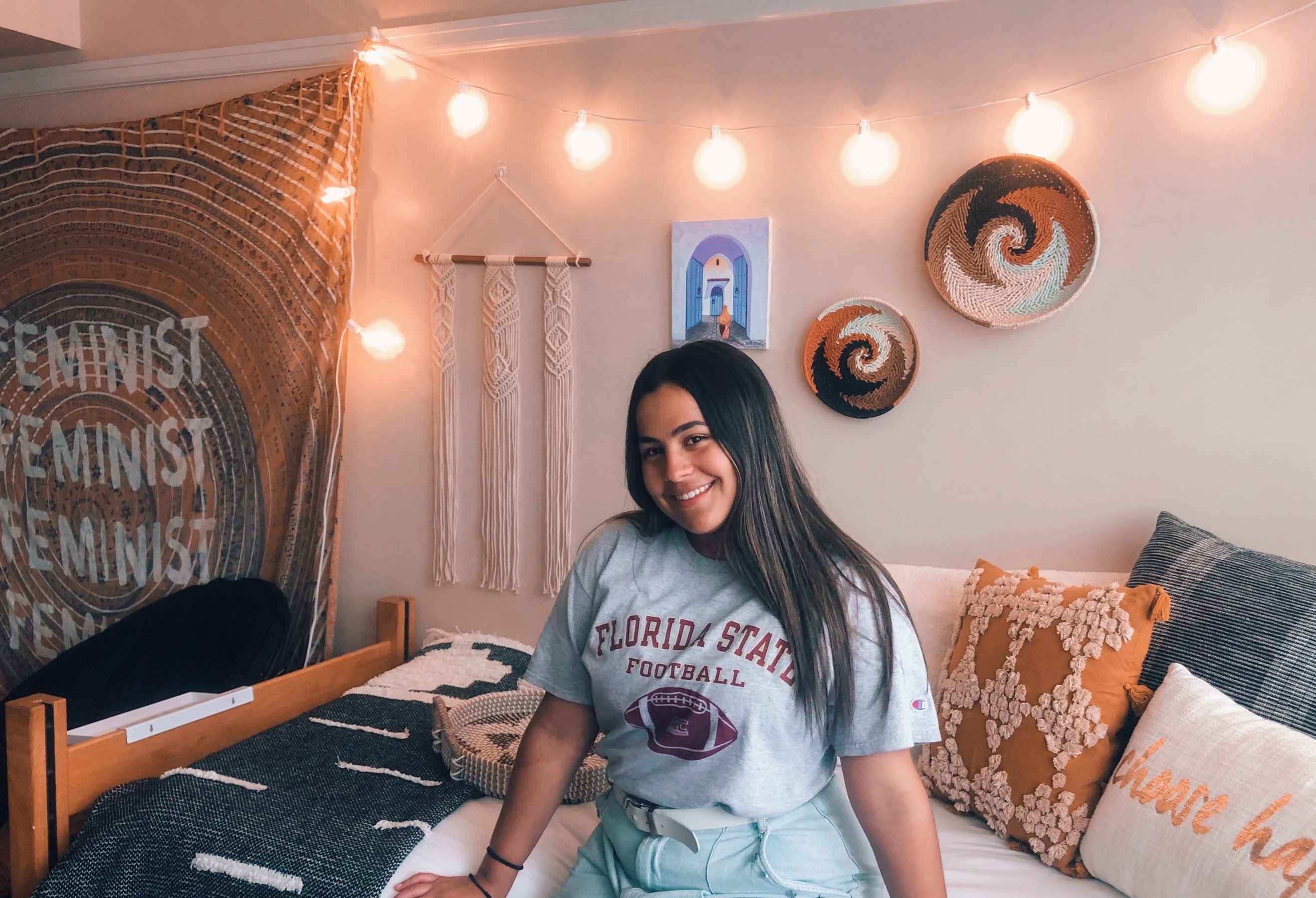 Gabi is a senior majoring in editing, writing and media and double minoring in general business and communications. Gabi currently resides in Landis Hall which, if you didn’t already know, is exclusively for honor students. Not only that but she lives in a single-style dorm that has a direct view of Landis Green, can you say ~jealous~? When I walked into Gabi’s dorm, it was like walking right into my freshman dream-dorm Pinterest board! This was pretty coincidental because she credits Pinterest for helping her plan and finding the inspiration that made her dream dorm a reality. I asked what style she was going for and she said that she wanted to stick to warm and neutral tones, as well as finding inspiration from her traveling. Gabi explained that she discovered her love for traveling after studying abroad in Valencia, Spain in the spring of 2018. It was in this semester that she found the piece she would build her future dorm around. While visiting Morocco, Gabi bought a small painting from a young boy who hand-painted the piece himself. She credits this piece to being her favorite décor item in her room as it is displayed right over her bed for all to see. Also while visiting Morocco, Gabi noticed all the intricate pieces and the way the culture plays with textures. These elements can be seen throughout her dorm whether it’s the blankets, rugs or the pillows. She also mentioned when she was on the hunt at Target, TJ Maxx, or HomeGoods, her goal was to find pieces that look super authentic and potentially handmade from the culture it was inspired from. I then moved on to ask her how it was working with a smaller space. Gabi answered that she wanted to divide the room into sections to make it feel more like home. When you first walk in you can see how she decorated the space to look like a little living room. Her feminist tapestry is above this carpeted area with an adorable chair to serve as the “couch”. It was amazing to see how one can transform a dorm in such a way. Gabi truly made her dorm Pinterest board. Come to life!