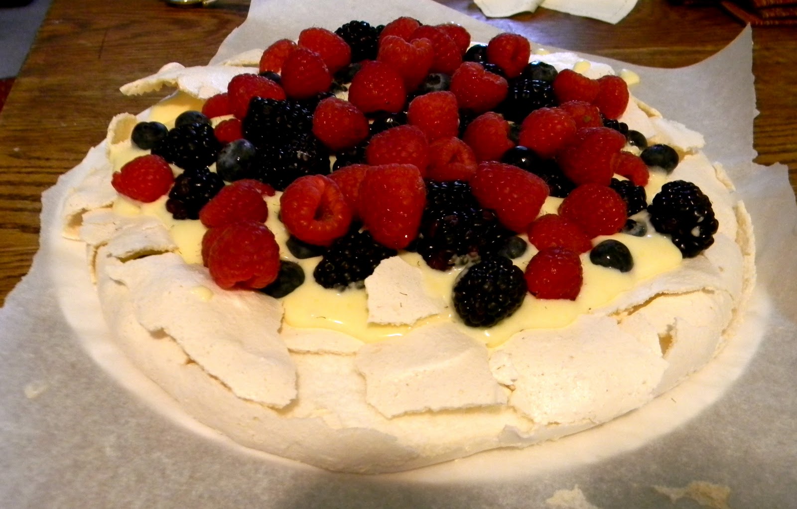 - Spoon lemon curd into meringue and mound berries on top.