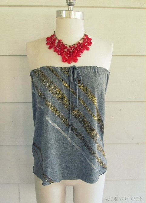 I’m getting a very early 2000s, Lizzie McGuire vibe from this strapless shirt made from a basic tee, and I LOVE it! This is totally something I probably would have worn in middle school but for some reason I think it would be super cute on and is also super easy to make.