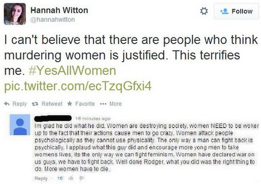 This trend did not just appear spontaneously; it was a reaction to the disturbing actions and manifesto of Elliot Rodger, who murdered five people in a spree killing before taking his own life, and was quoted to have said that if women had just done what they were supposed to do, which was to satisfy men, specifically him, then the killings would never have happened.
