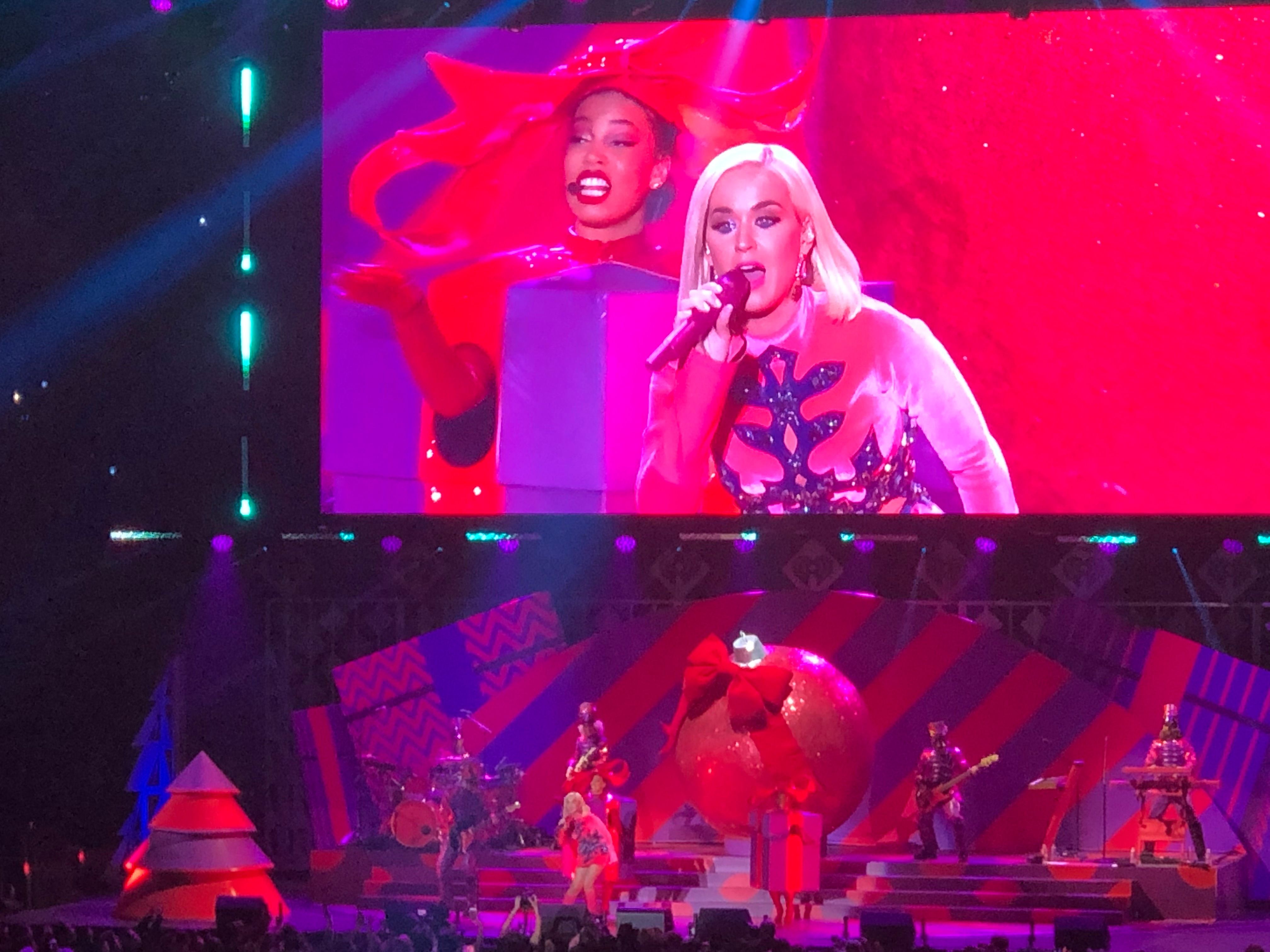 Katy Perry was next to take the stage (yes, definitely a throwback) dolled up in a tight pink dress with blue snowflake cutouts. Definitely the cutest outfit of the night! Katy had her usual stage dancers, similar to the infamous left shark, including a dancing christmas tree and two dancing gift boxes. The crowd sang along as she performed a bunch of throwbacks including “Teenage Dream,” “I Kissed A Girl,” “Dark Horse,” “Roar” and “Firework.”