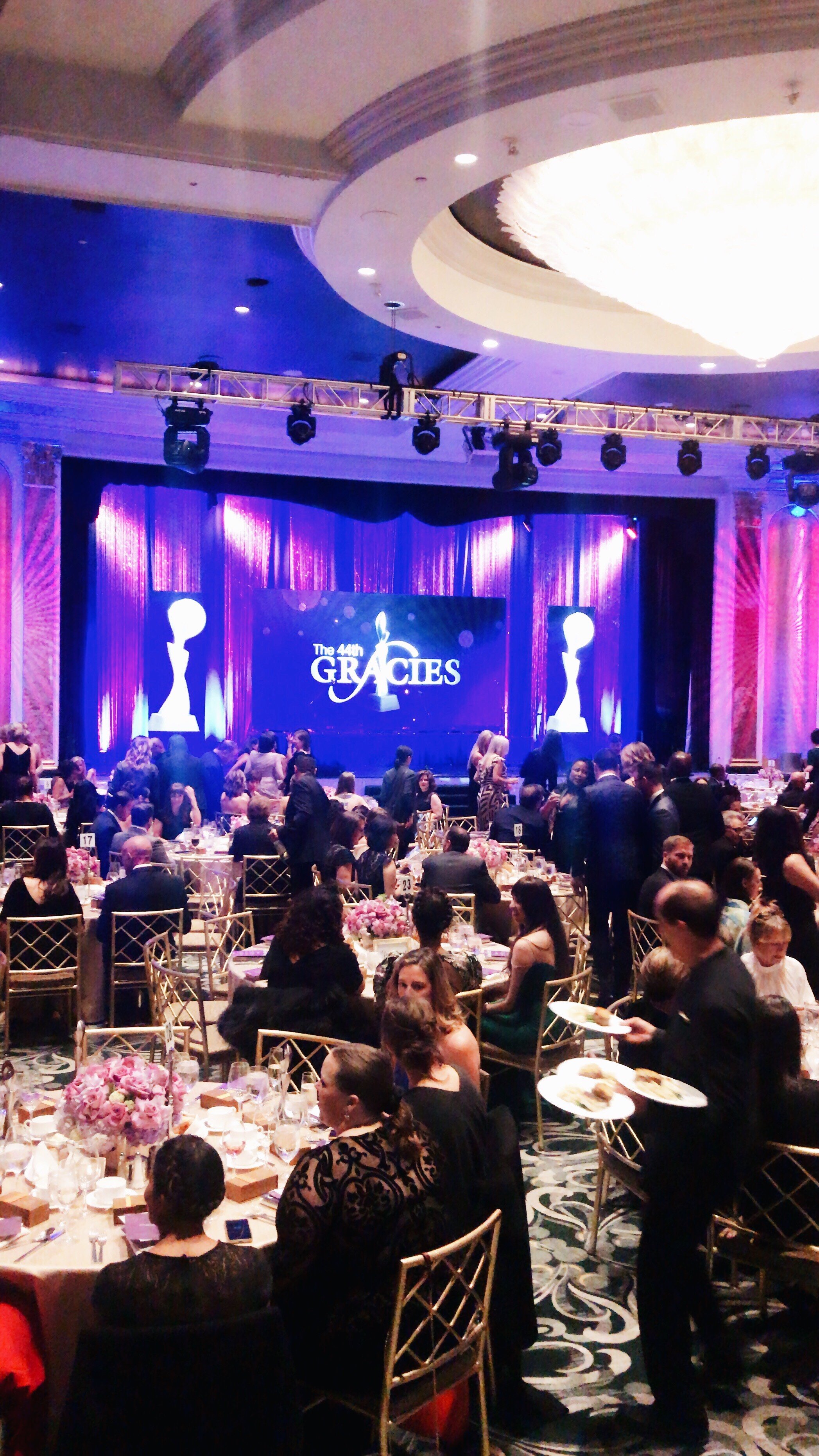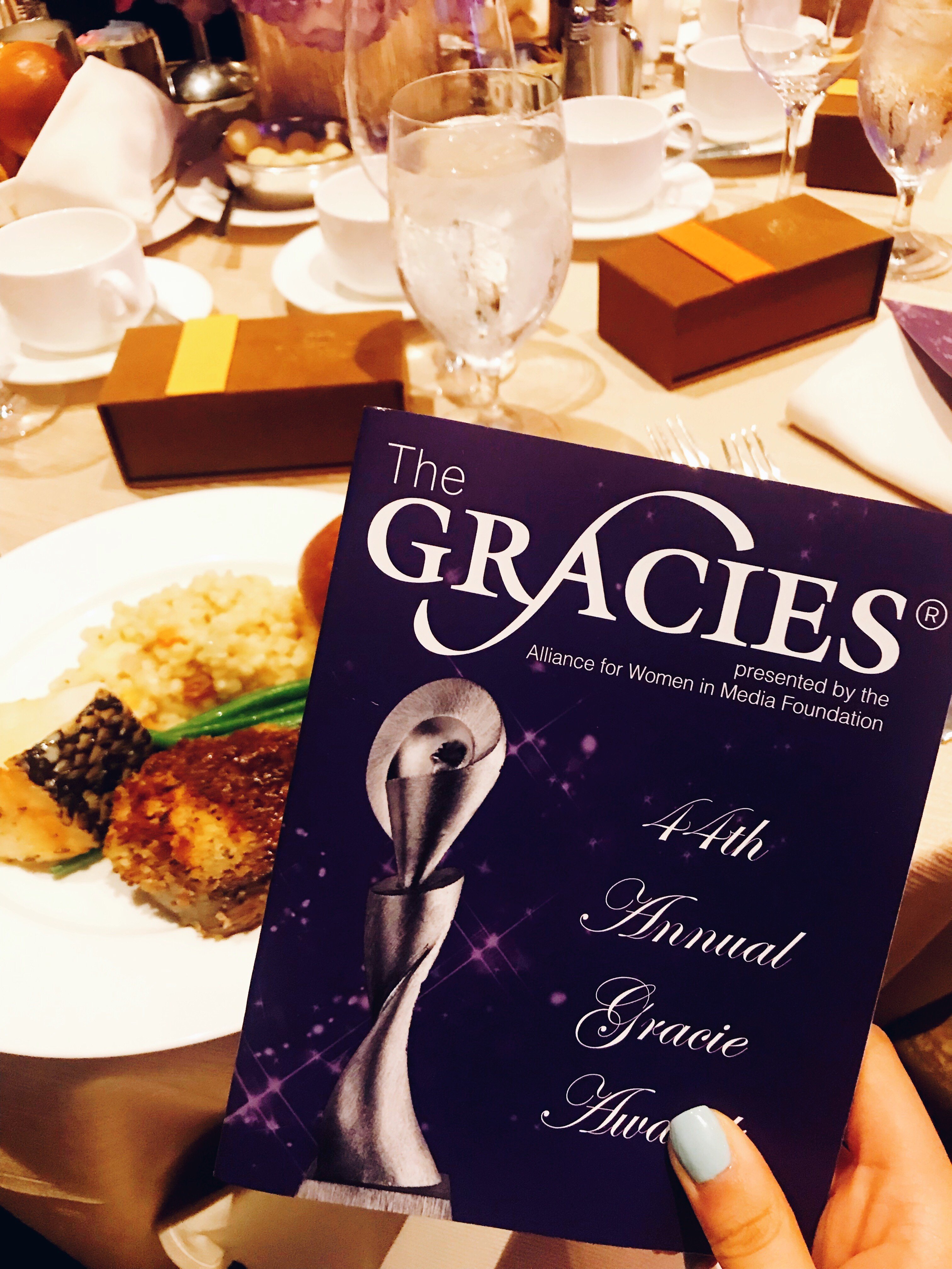 This year, the Gracie Awards took place at the beautiful Four Seasons Beverly Wilshire Hotel. The venue was stunning and the color purple flourished everywhere, creating an elegant ambiance. Each table was served a menu of horseradish gremolata crusted tenderloin, Chilean sea bass and Israeli couscous, rosemary essence. The dessert was presented in adorable packing, and consisted of truffles, macaroons and mini chocolates. Superstore actress, Lauren Ash, was the host of the night and kept the audience on their toes with her wit. During her opening speech, she encouraged the audience to mingle, urging that “the movement for equal rights is in process.” One of the major themes of the show was bravery, celebrating the women who speak truth in all the platforms they work in.