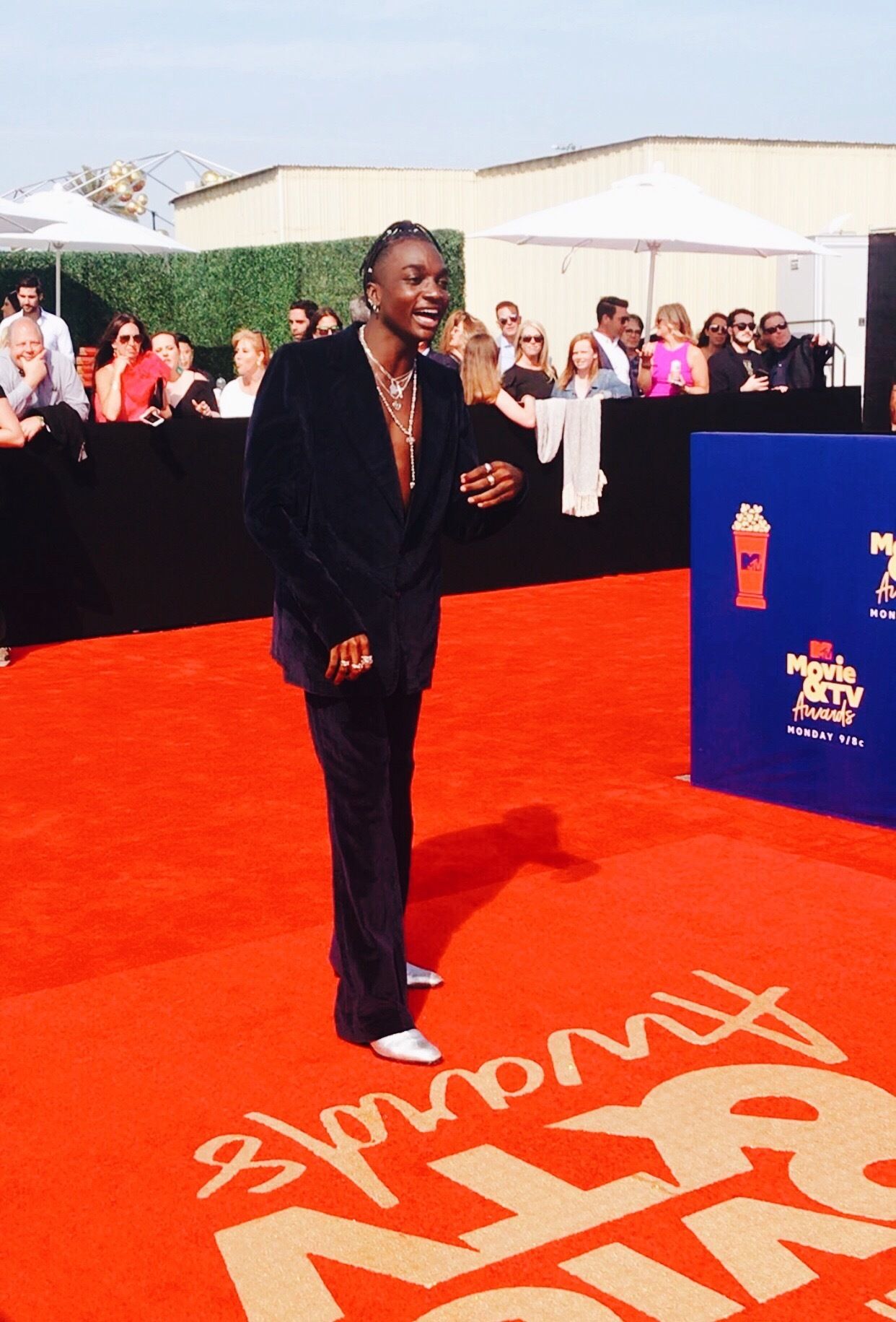 Internet personality, Rickey Thompson, who rose to fame through his funny videos on Vine and Instagram, stopped to take a photo near the MTV logo on the carpet.