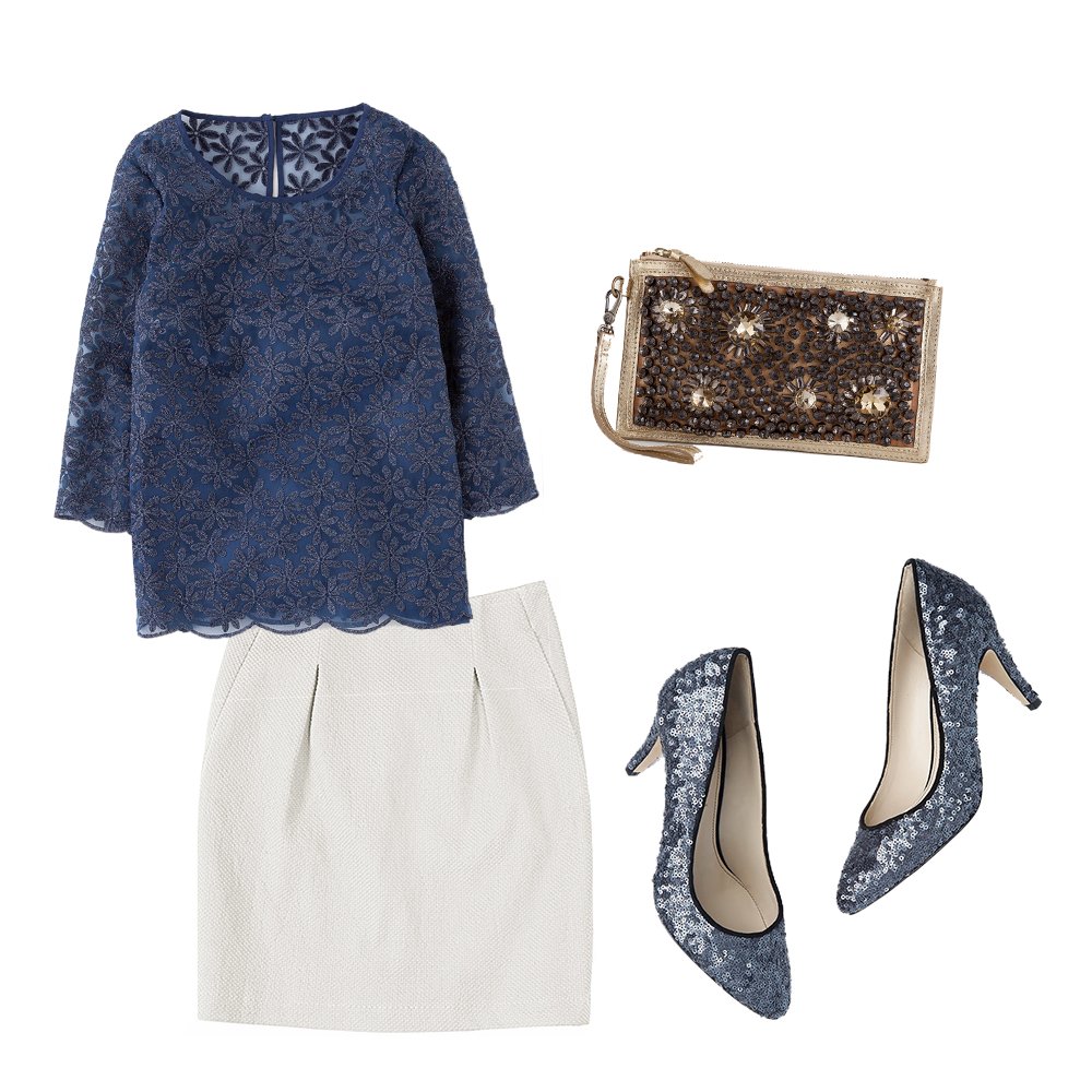 For any polished holiday party, you’ll want to look the part! Keep your look simple and chic with a delicately detailed top tucked into a neutral skirt, and don’t forget to add that extra pop of glitter with a knockout clutch and heels. Violà – you’re ready to make some memories!