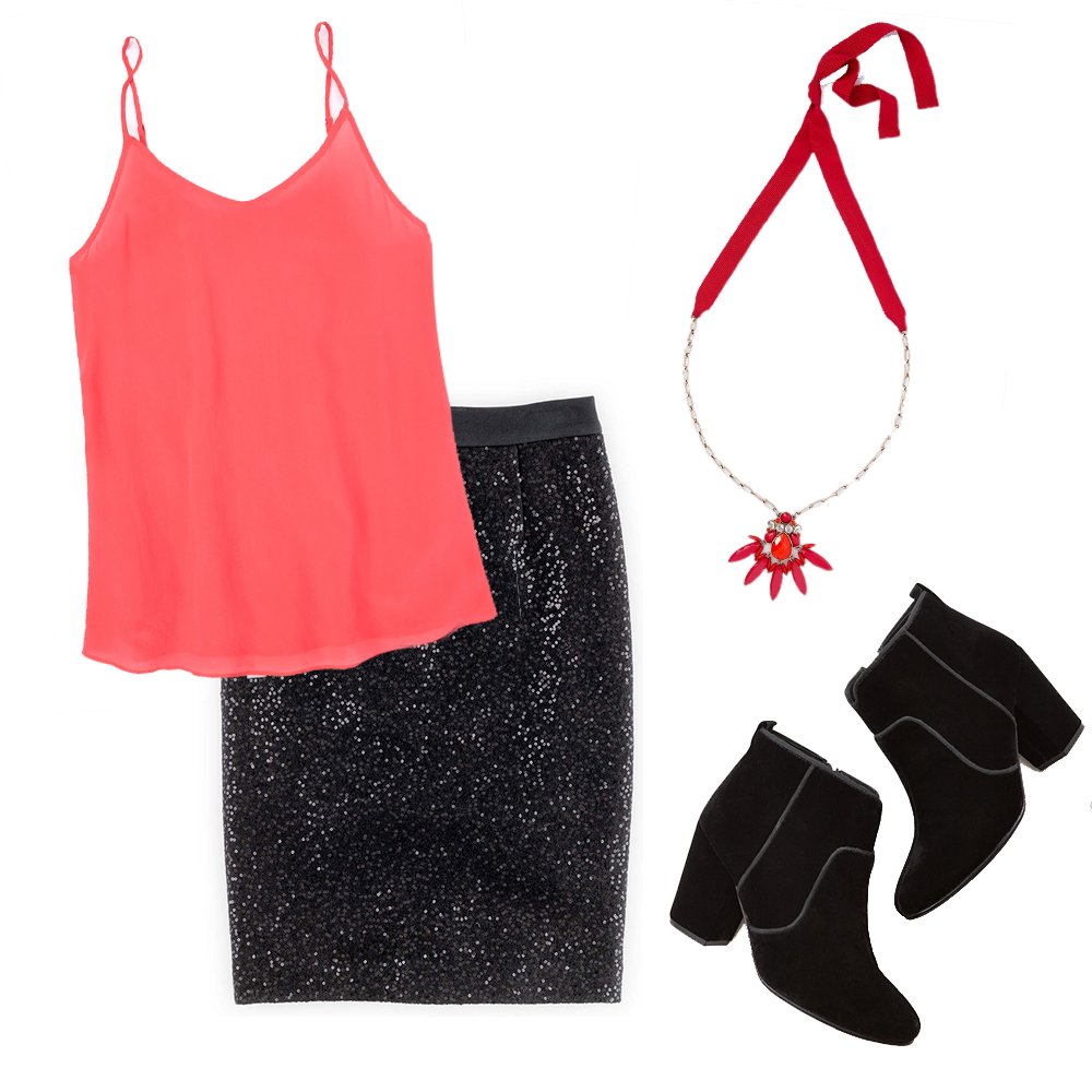 Who says you have to cover up completely for winter? Show off your best self at holiday parties! This slinky camisole is fabulously flattering, and you’re sure to turn heads with this glimmering, shimmering skirt. What better time to rock sparkle?!