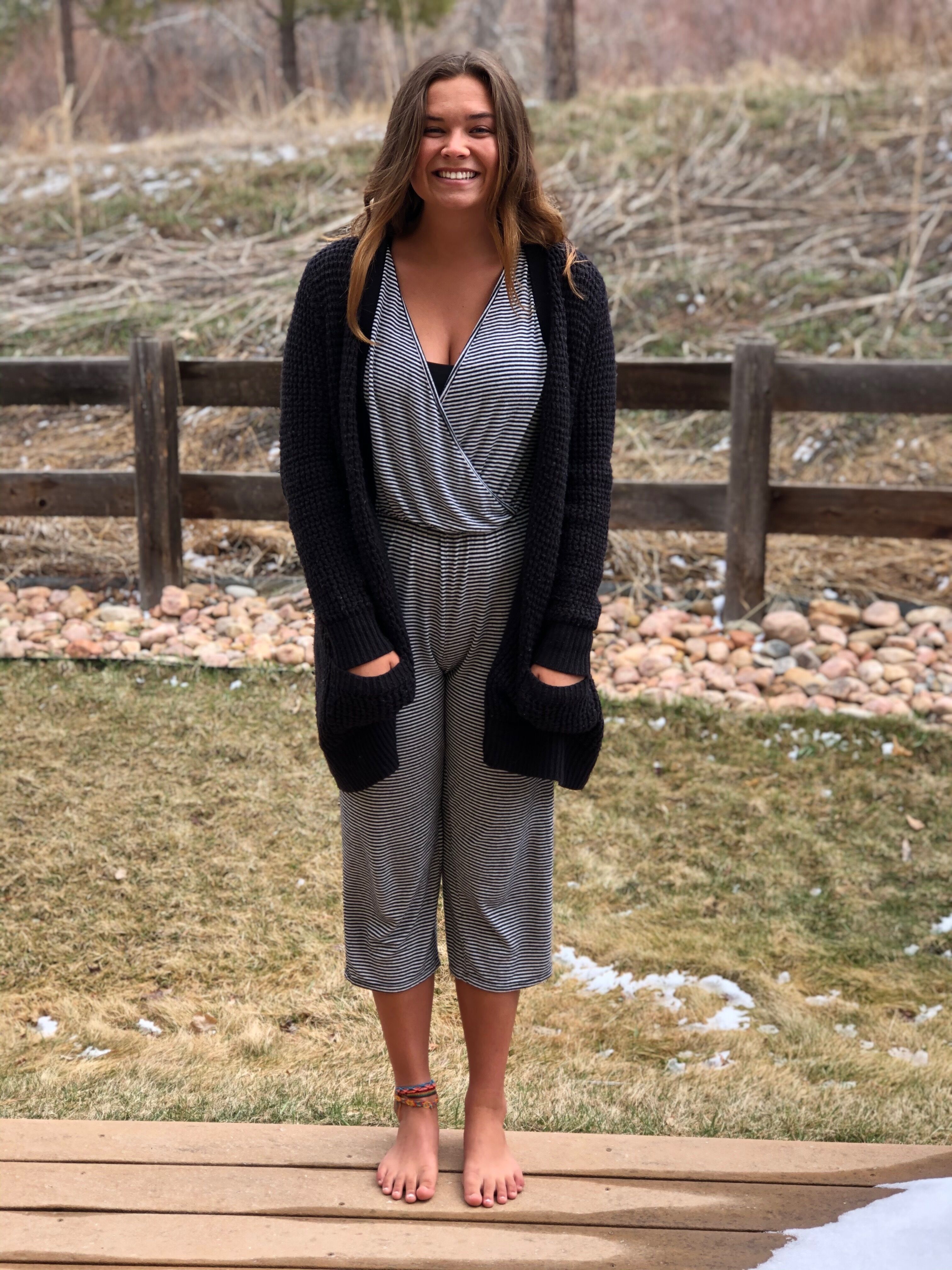 This is definitely one of the comfiest outfits I own that’s still presentable, and I’ve worn it when traveling plenty of times. No shoes because I hate shoes, and I’m inside all day anyway. I came outside to my cold, snowy (but melting!) backyard in Colorado to get a few minutes of fresh air. I’ve been doing Zoom Pepperdine classes in outfits like these, continuing my tutoring job via FaceTime, and using my extra time to watercolor and get into Adobe Illustrator!